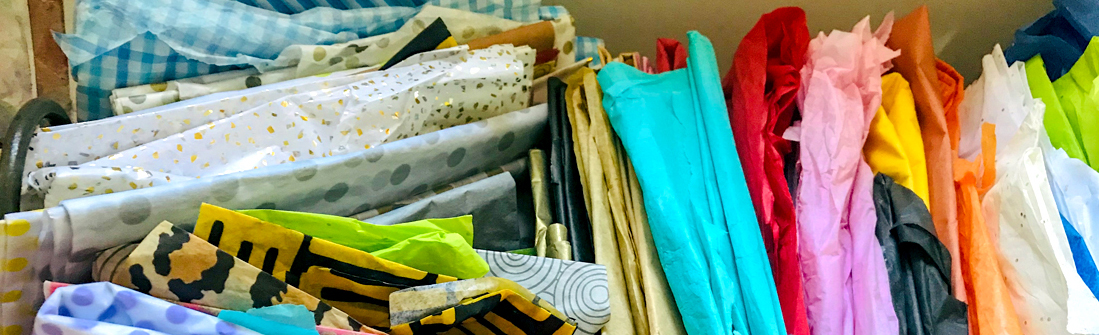 Paper; any printed tissue paper or napkin (separated from the backing layer) will work. Patterns, solid, gradated, sparkles, metallic – anything. And you would be amazed at the variety available.